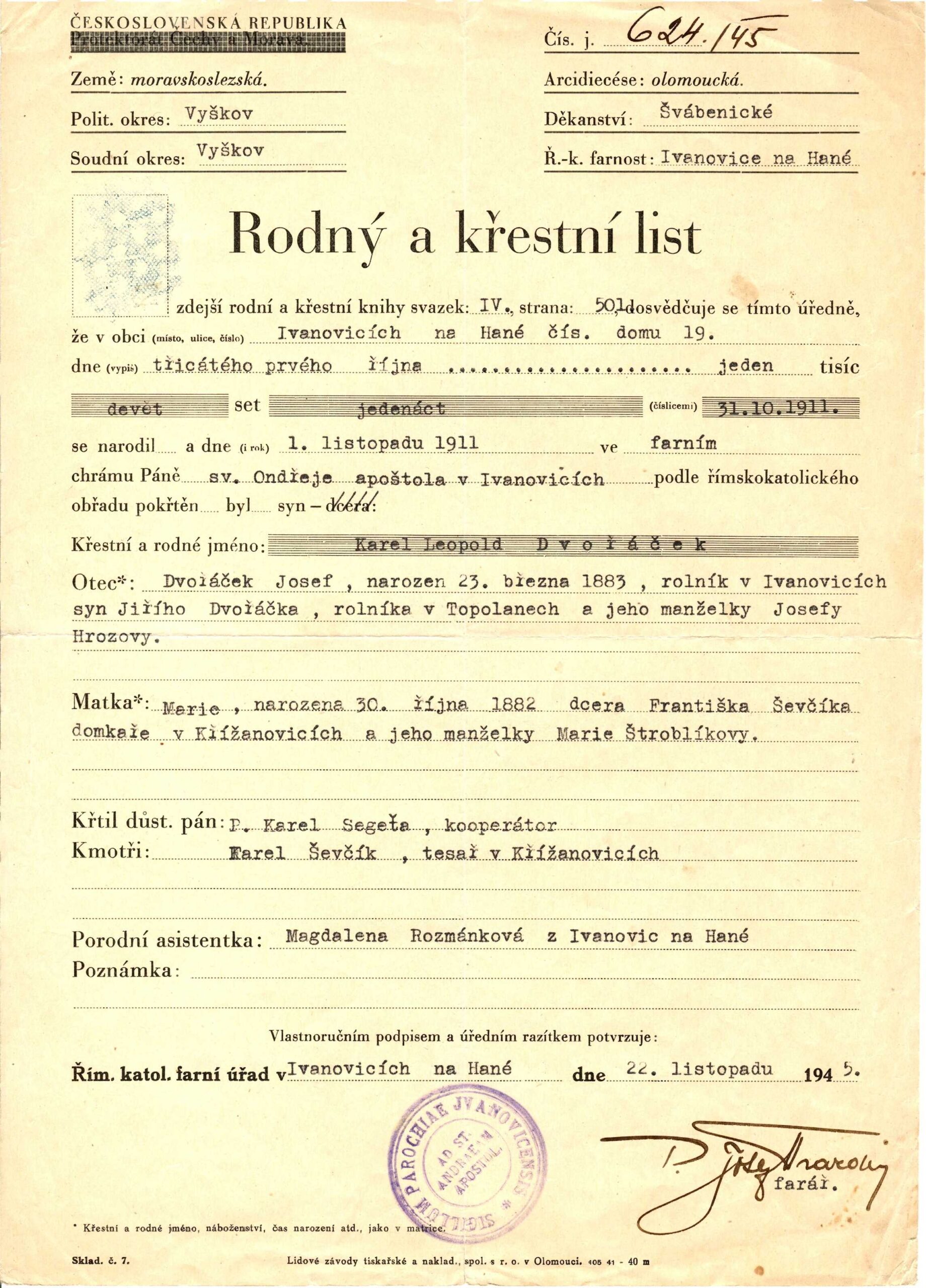 * 31. 10. 1911, Ivanovice na Hané